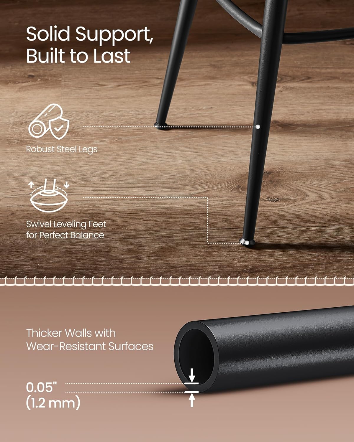Steadfast Stability, Gentle on Floors: With splayed steel legs forming a rock-solid foundation, complemented by swivel leveling feet, these bar chairs not only offer unwavering stability on uneven surfaces but also promise scratch-free contact.